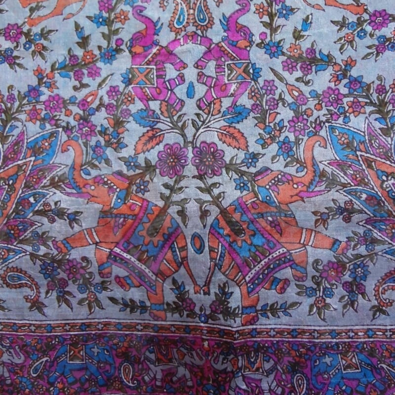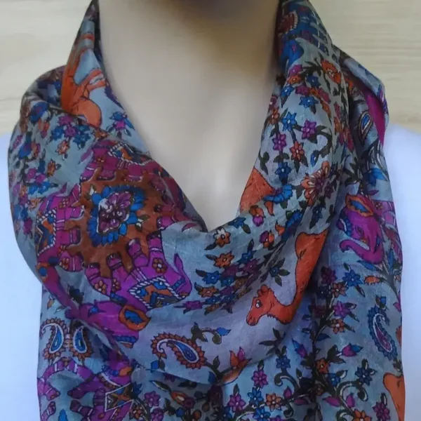 Zijden sjaal met kleurige print, vederlicht geweven. Is zacht, soepel en draagt comfortabel.
