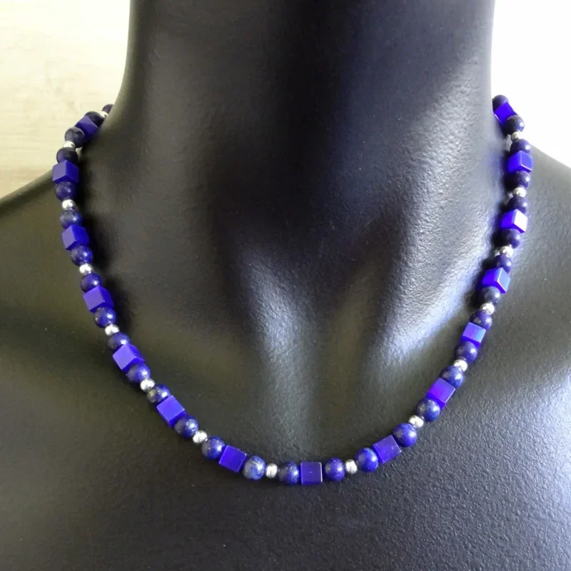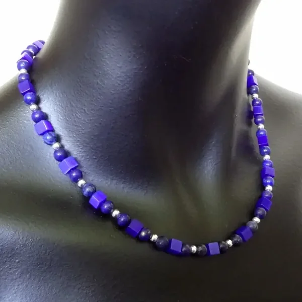 Ketting van lapsi lazuli en paars-blauwe cat's eye blokjes (6mm), afgewisseld met 925 zilveren kraaltjes. Deze ketting is 50cm lang en heeft een stevig zilveren karabijnslotje.
