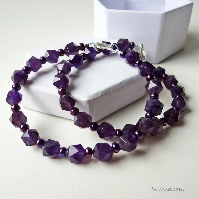Armbandje van amethist en glazen kraaltjes. De vlakjes op de kralen weerspiegelen het licht bij elke beweging.