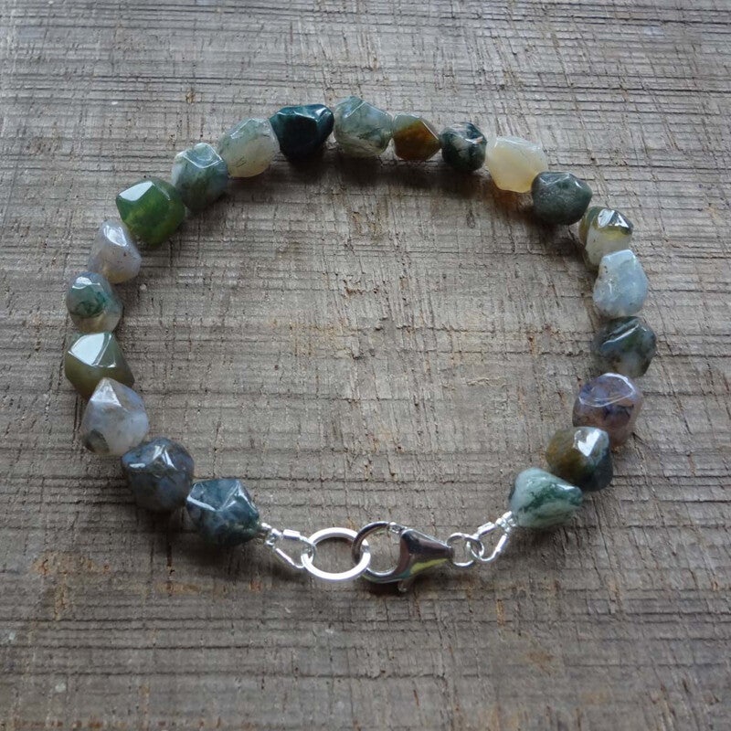 Armband van geslepen agaat nuggets in verschillende natuurlijke kleuren. De armband is 21,5cm lang en sluit met een stevige zilveren sluiting.