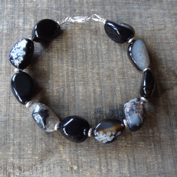 Armband van gepolijste onyx nuggets en tibetaans zilveren rondellen. De armband is 21cm lang, se sluiting is van sterling zilver