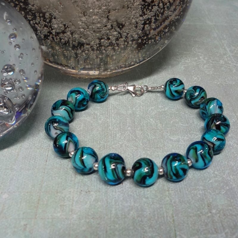 De kleuren van de zee zie je terug in deze armband van handgemaakte lampwork kralen 12 mm, afgewisseld met kleine zilveren kraaltjes.