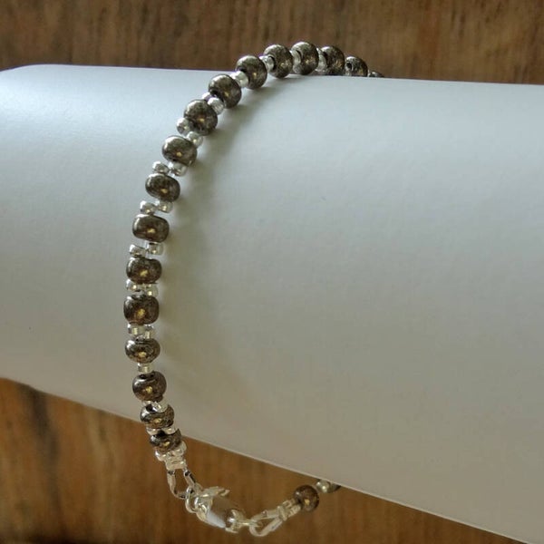 Armbandje van metallic en zilveren kraaltjes, dat eigenlijk overal bij gedragen kan worden. Het is 19cm lang en sluit met een sterling zilveren slotje.