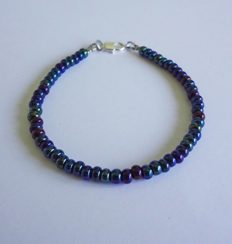 Armbandje van kleine metallic blauwe kraaltjes 4mm. De lengte van het armbandje is inclusief sluiting 19cm