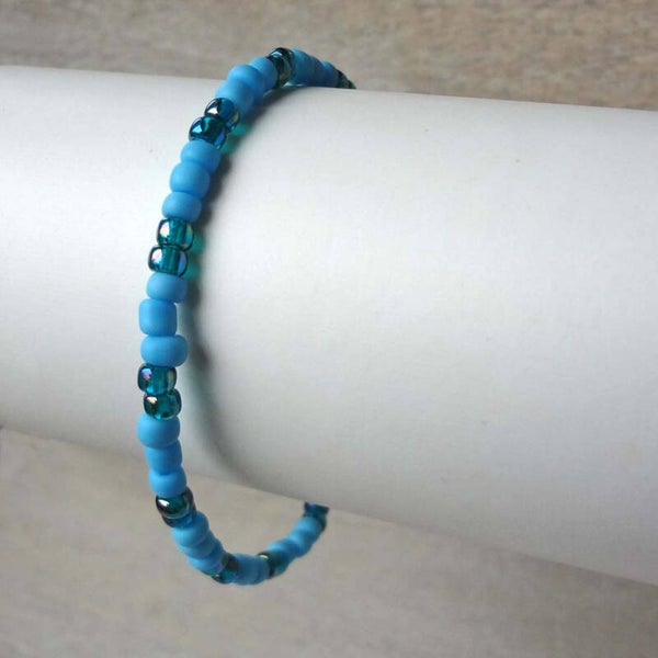 Armbandje van aquablauwe kraaltjes en glaskraaltjes. Het armbandje is 20cm lang en heeft een zilveren sluiting
