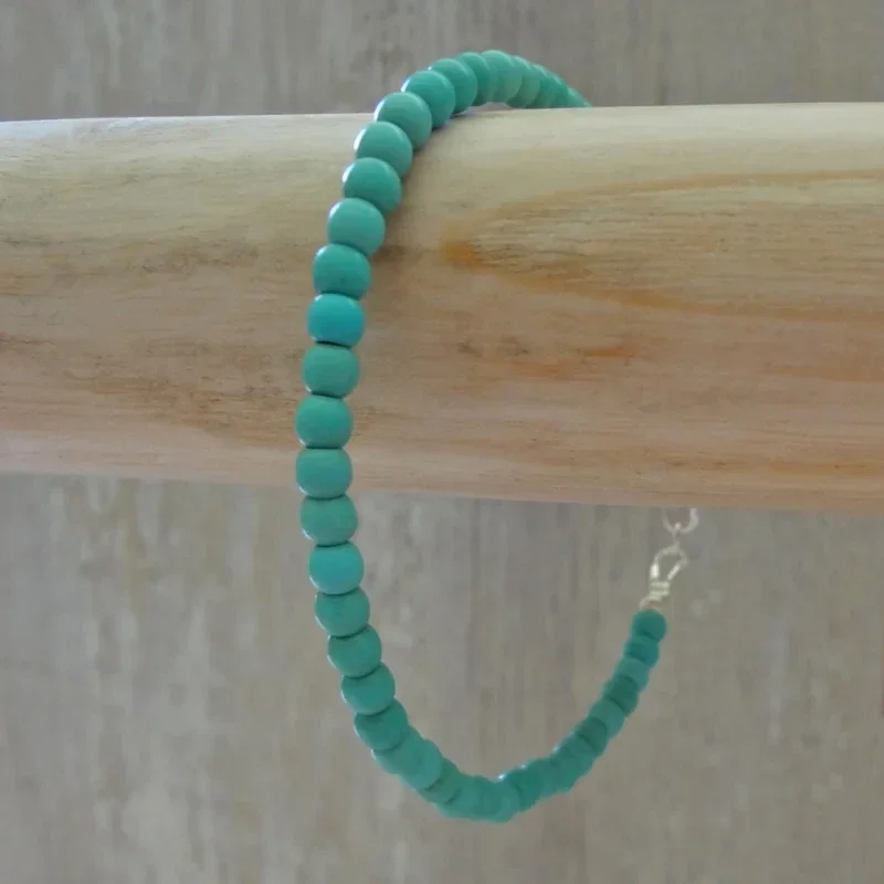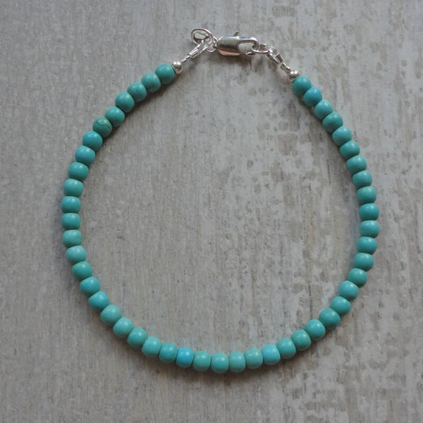 Armbandje van kleine turquoise kraaltje (4mm), afgewisseld met zilveren kraaltjes (3mm).