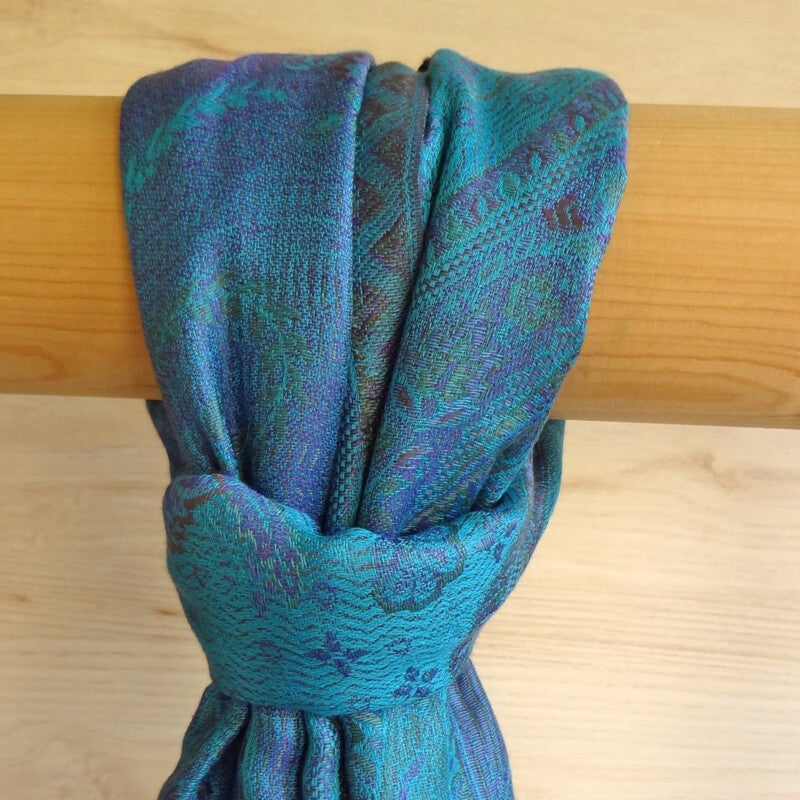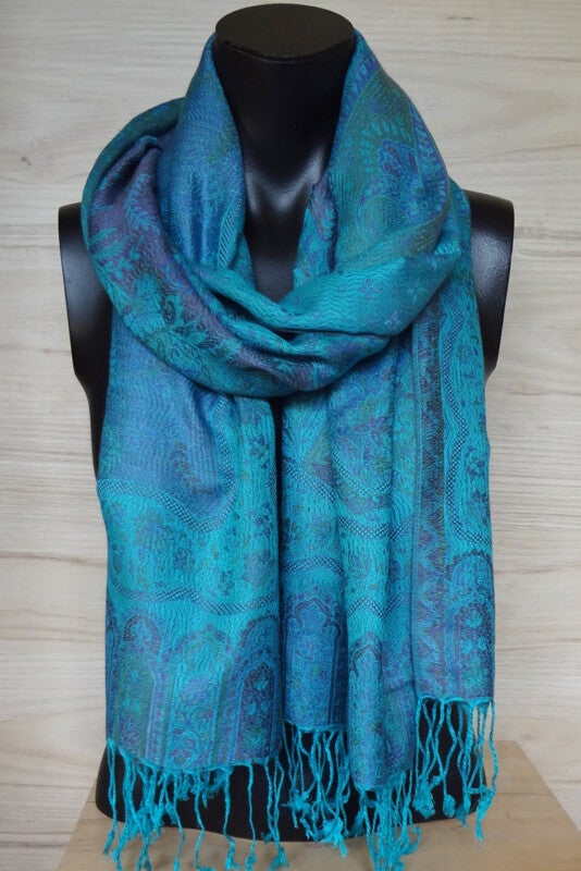 Luxe sjaal van zijde/modal in blauwtinten . De sjaal heeft ingeweven paisley dessin, is zacht en soepel .