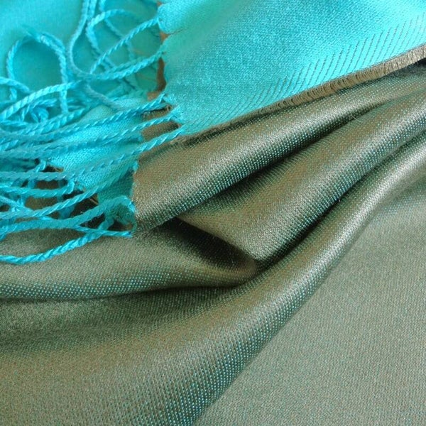 Reversible sjaal van 100% zijde in warme contrasterende kleuren, met gedraaide franje. Deze kwaliteit zijden sjaal heeft een prachtige glans en kleuren die veranderen bij elke beweging.