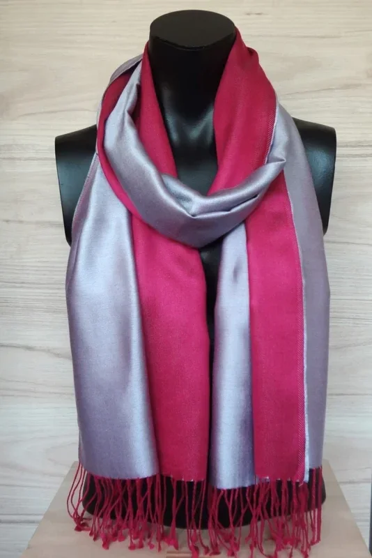 Reversible sjaal van 100% zijde in warme contrasterende kleuren, met gedraaide franje. Deze kwaliteit zijden sjaal heeft een prachtige glans en kleuren die veranderen bij elke beweging.
