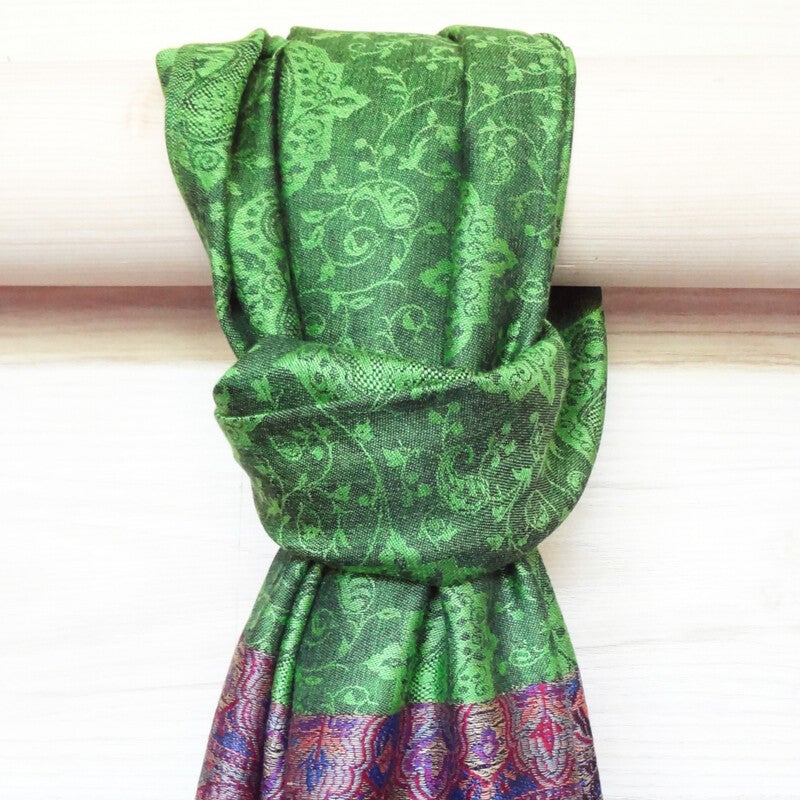 Prachtige groene sjaal met ingeweven patroon. Deze sjaal heeft een luxe uitstraling en een licht glanseffect. Kan op zowel een stijlvolle als nonchalante manier gedragen worden.