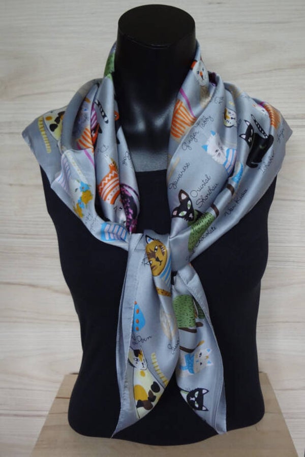 Vierkante sjaal met kleurige afbeeldingen van verschillende soorten katjes.