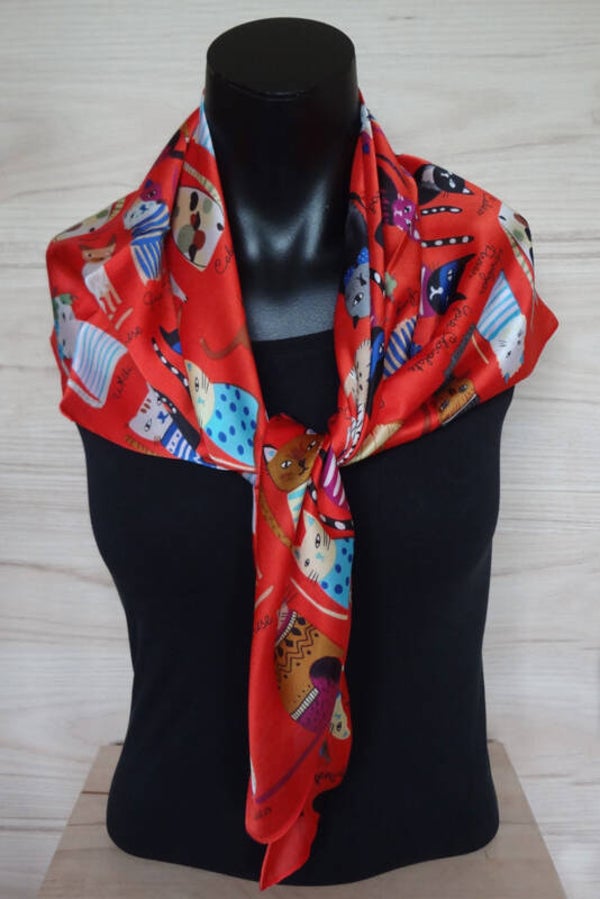 Vierkante sjaal met kleurige afbeeldingen van verschillende soorten katjes.