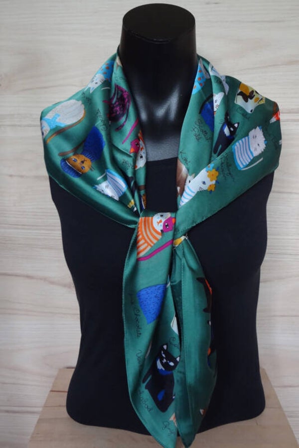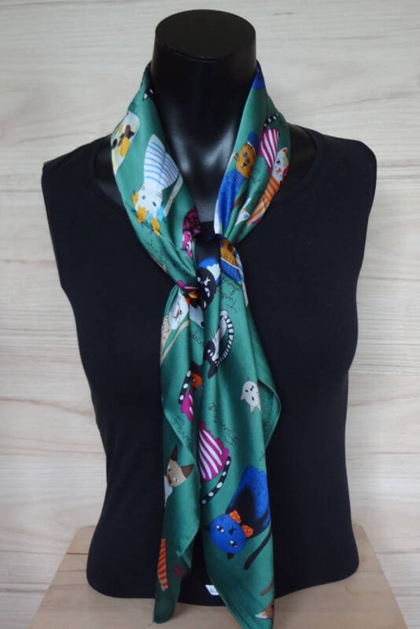 Vierkante sjaal met kleurige afbeeldingen van verschillende soorten katjes.